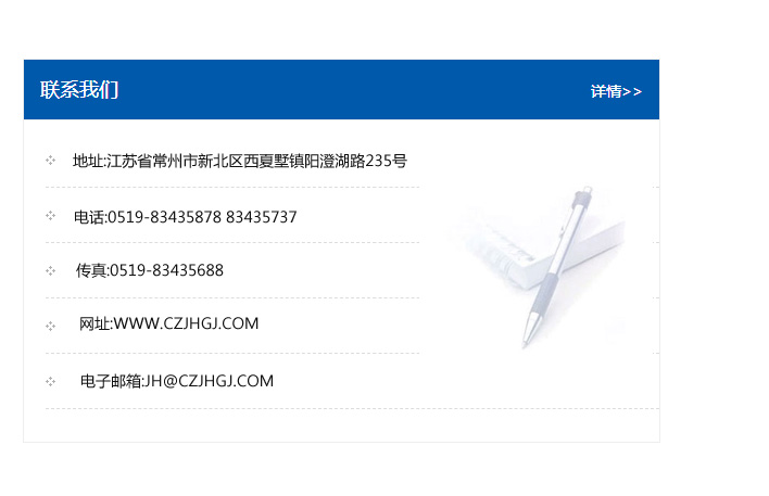 地址:常州市新北區友邦商務大廈1幢16、17層  電話:0519-85101652  傳真:0519-85112595  郵編:213022  網址:www.cz-jiayue_cn.luosi100.com  郵箱:xiajifengaa@163.com